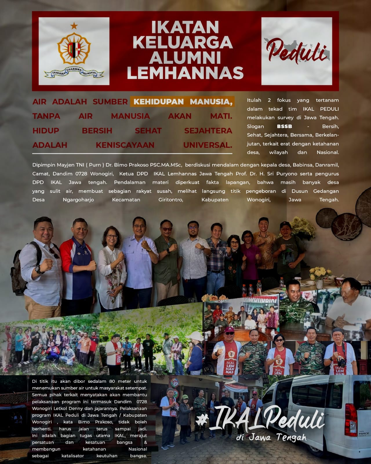 <p>Air adalah sumber kehidupan manusia. Tanpa air manusia akan mati. Hidup bersih sehat sejahtera adalah keniscayaan universal. Itulah 2- fokus yang tertanam dalam tekad tim IKAL PEDULI melakukan survey di Jawa Tengah. Slogan BSSB - Bersih Sehat Sejahtera Bersama Berkelanjutan, terkait erat dengan ketahanan desa, wilayah dan Nasional. Dipimpin Mayjen TNI (Purn) Dr. Bimo Prakoso PSC.MA.MSc, berdiskusi mendalam dengan kepala desa, Babinsa, Danramil, Camat, Dandim 0728 Wonogiri, Ketua DPD IKAL-Lemhannas Jawa Tengah Prof. Dr. H. Sri Puryono serta pengurus DPD IKAL Jawa tengah. Pendalaman materi diperkuat fakta lapangan, bahwa masih banyak desa yang sulit air, membuat sebagian rakyat susah, melihat langsung titik pengeboran didusun Gedangan desa Ngargoharjo kecamatan Giritontro kabupaten Wonogiri. Dititik itu akan dibor sedalam 80 meter untuk menemukan sumber air untuk rakyat setempat. Semua pihak terkait menyatakan akan membantu pelaksanaan program ini termasuk Dandim 0728 Wonogiri Letkol Denny dan jajarannya. Pelaksanaan program IKAL Peduli di Jateng/kabupaten Wonogiri , kata Bimo Prakoso, *tidak boleh berhenti. harus jalan terus sampai jadi*. Ini adalah bagian tugas utama IKAL, merajut persatuan dan kesatuan bangsa &amp; membangun ketahanan Nasional sebagai katalisator keutuhan bangsa.</p>