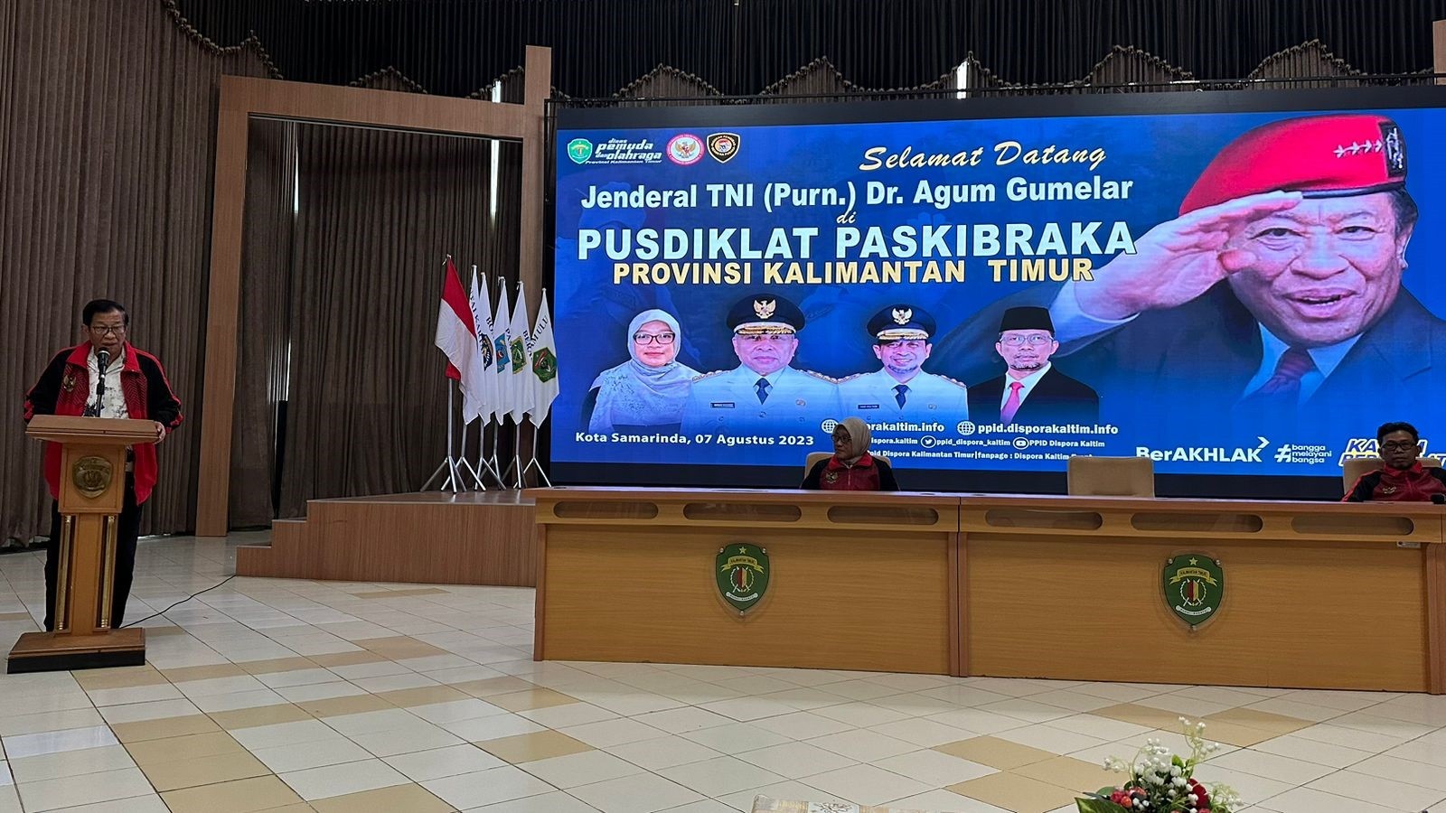 <p>Ketua Umum DPP IKAL-Lemhannas Jenderal TNI (Purn) Agum Gumelar memberikan sambutan dan pembekalan kepada para anggota Paskibraka Provinsi Kalimantan Timur pada acara Pusdiklat Paskibraka Provinsi Kaltim di Samarinda 7 Agustus 2023</p>