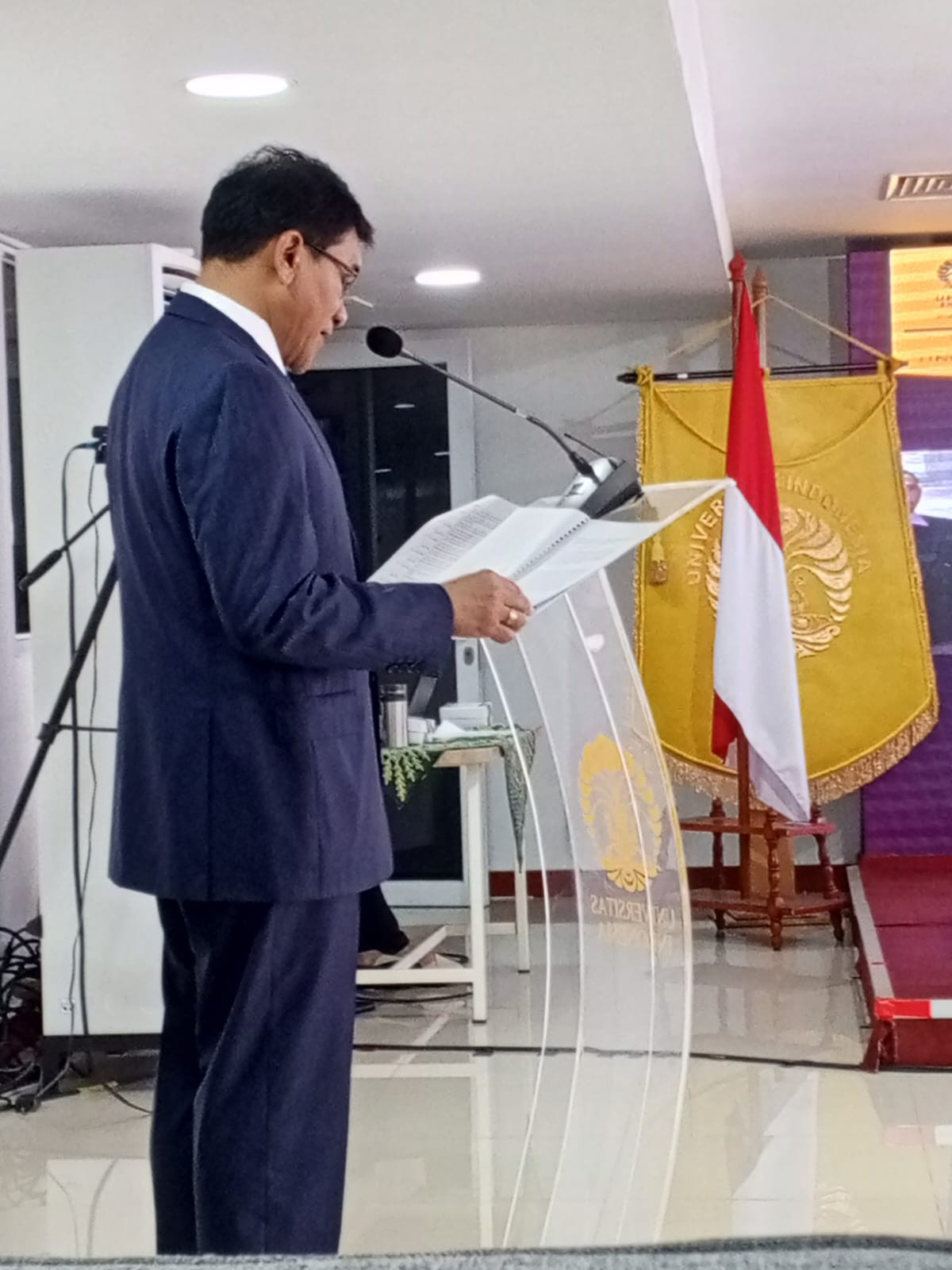 <p>Sidang Promosi Doktor Sekolah Ilmu Lingkungan Universitas Indonesia. Promovendus Fabian Buddi Pascoal sedang menyampaikan summary disertasi di kampus UI Salemba lt. 5 Jakarta Pusat. ( 17/2/24 )</p>